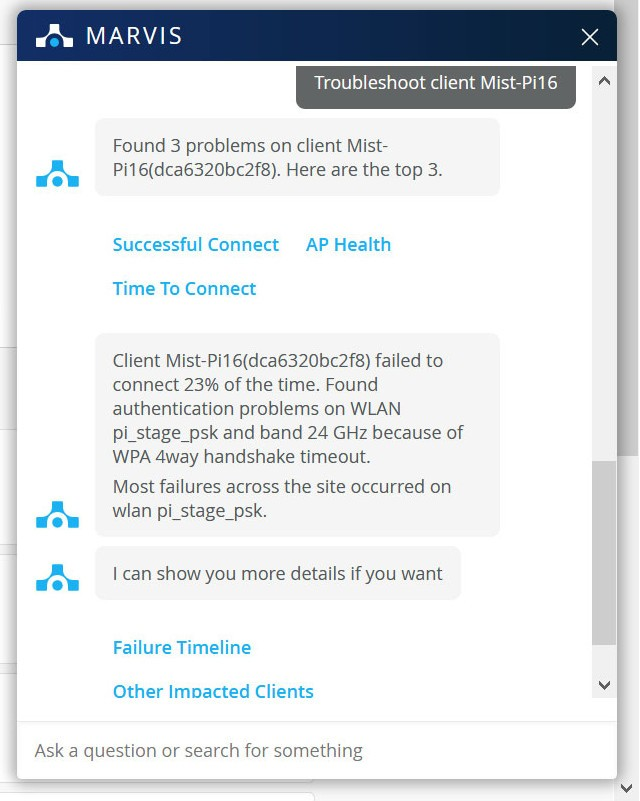 Hat ein Client Schwierigkeiten sich mit dem WLAN zu verbinden, bietet Juniper Mist mehrere Tools zur Fehlerdiagnose. Im Mist-Dashboard können Sie unter „Monitor“ > „Clients“ den betroffenen Client auswählen und dessen Verbindungsversuche analysieren. Besonders hilfreich ist die Nutzung von Marvis, dem virtuellen Netzwerkassistenten. Durch Eingabe von Befehlen wie „Troubleshoot [Client-Name]“ erhalten Sie detaillierte Informationen über mögliche Ursachen und erhalten entsprechende Handlungsempfehlungen.