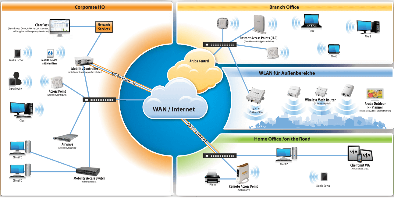 - Integration in bestehende Netzwerkinfrastruktur (z. B. mit Aruba oder Cisco Komponenten)